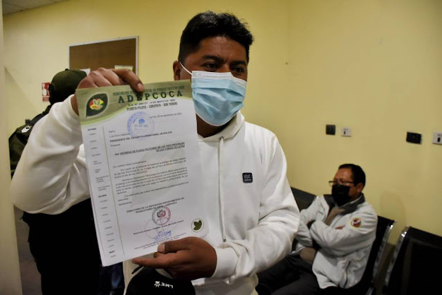 El presidente de la Asociación Departamental de Productores de Coca (Adepcoca), Freddy Machicado, y otros dirigentes cocaleros de los Yungas se presentaron este viernes en el nuevo Palacio de Gobierno para entregar el pliego petitorio de su sector y pedir una reunión con el presidente Luis Arce.