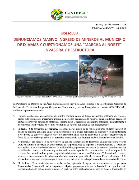 Además, la cronología de los hechos indica que, desde hace tres días, es decir el 20 de noviembre – una camioneta con barranquilleros y herramientas para el lavado de oro ingresó a la población de Ixiamas –, todos los días flotas y vehículos Ipsum ingresan a mineros hasta la comunidad. Un hecho que la Contiocap ha calificado como “prácticamente una invasión de nuestro pueblo”, según la denuncia.